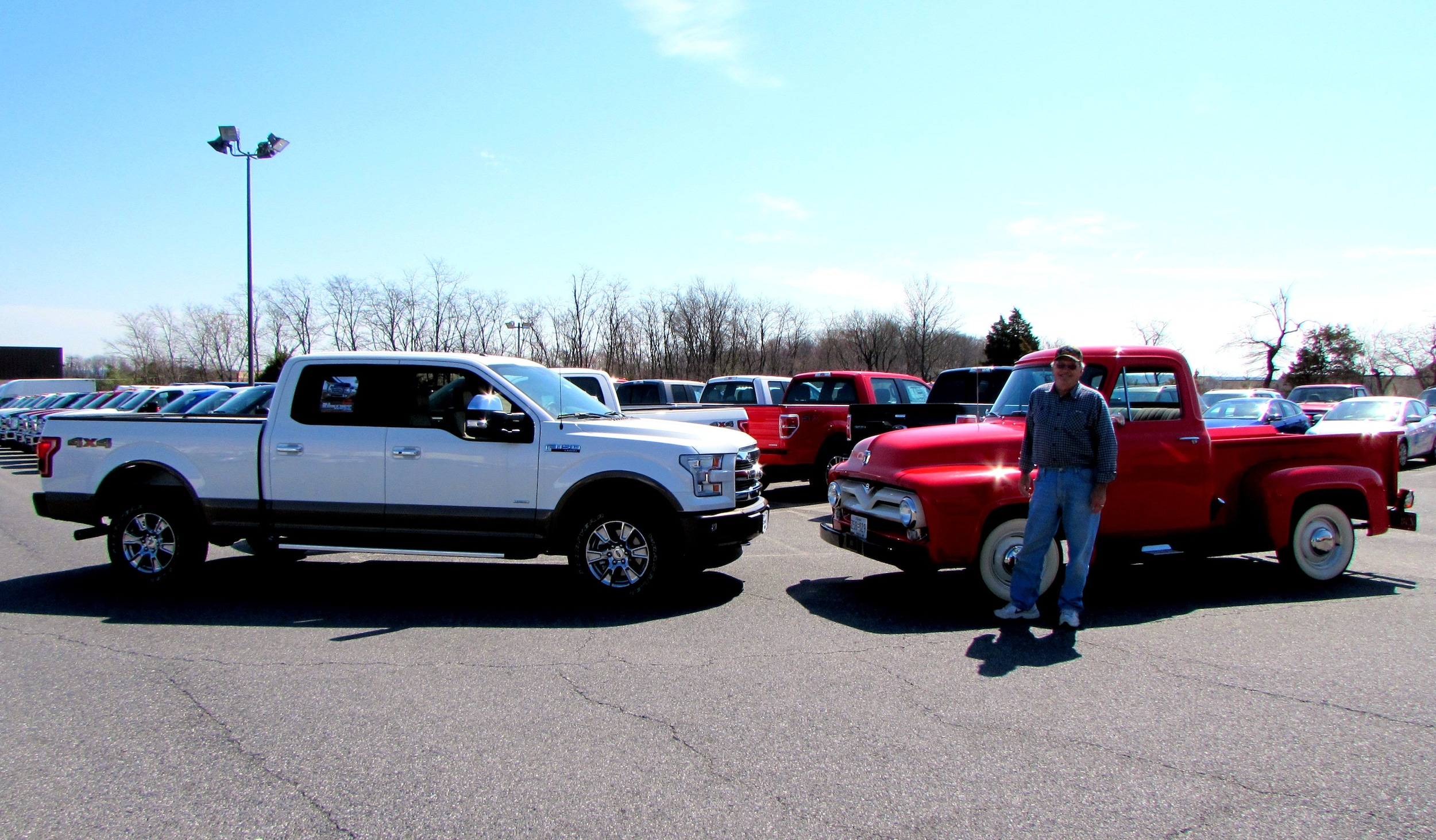 He is pictured with his new 2015 F-150 as well as his 1955 F-100.